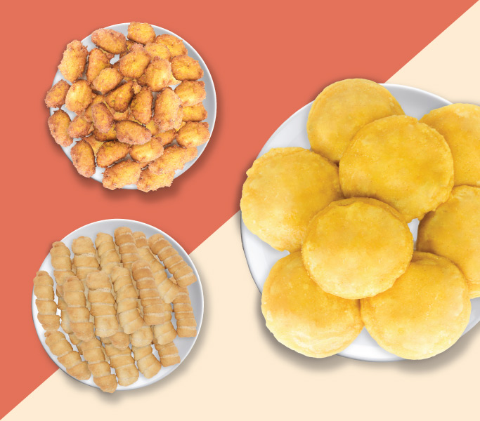 • 3 Deditos, 2 tortas de chócolo y 1 pastel de pollo tipo coctel